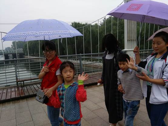 伴随着蒙蒙细雨,志愿者身着红色志愿服,风雨无阻的奔向蓝天残疾儿童健康中心。当志愿者到来的时候,孩子们都高兴的向志愿者打招呼,特别的兴奋,似乎志愿者已经成为他们最亲的亲人一样。然后志愿者陪着孩子在雨中漫步,在雨中孩子们很听话,志愿者也跟孩子讲解一些基本生活常识,如红绿灯的看法,还有各种汽车的名称等等。在此之间还时不时传来孩子天真无邪的笑声,看到孩子们很开心,志愿者也很满足。时间匆匆流逝,又到了难舍难分的时候。看着那些可爱的笑脸、回忆起那些美好的画面、那一朵朵即将绽放的花朵,志愿者们不禁潸然泪下,而他们的合影将这个美好的时刻定格。这次活动也使志愿者更加体会到了这些孩子们内心的想法,也让他们明白了,天下的孩子都一样,大家要更加小心的呵护他们。